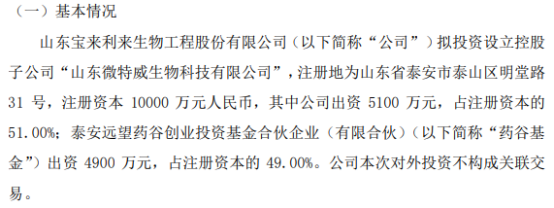 挖贝网5月21日◈✿,宝来利来(831827)近日发布公告◈✿,山东宝来利来生物工程股份有限公司(以下简称“公司”)拟投资设立控股子公司“山东微特威生物科技有限公司”利来国标w66◈✿,◈✿,注册地为山东省泰安市泰山区明堂路31号利来国标w66◈✿,◈✿,注册资本10000万元人民币◈✿,其中公司出资5100万元qq旋风2◈✿,占注册资本的51.00%◈✿;泰安远望药谷创业投资基金合伙企业(有限合伙)(以下简称“药谷基金”)出资4900万元qq旋风2◈✿,占注册资本的49.00%◈✿。公司本次对外投资不构成关联交易利来国标w66利来国标娱乐w66官网◈✿,◈✿。